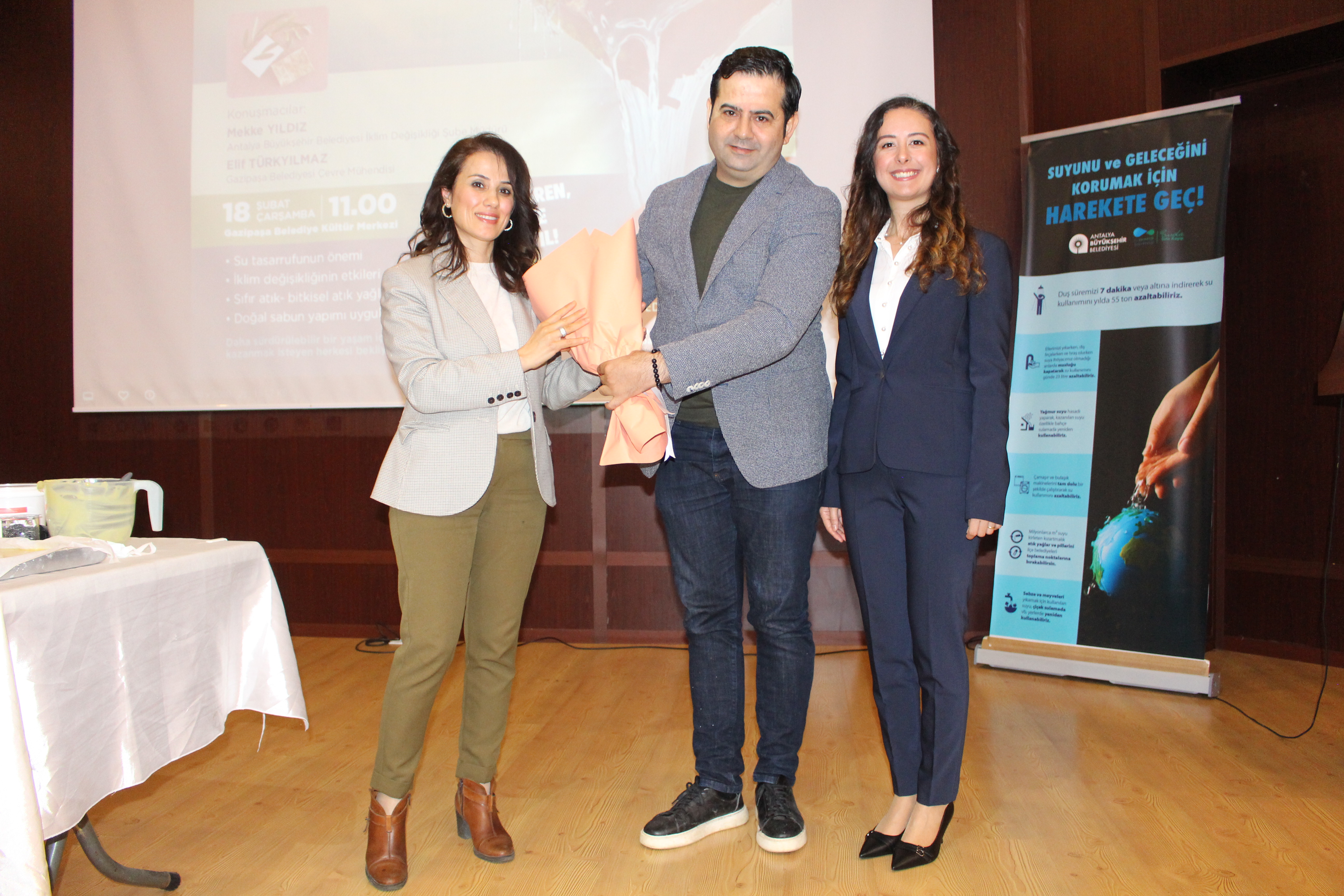 Programın ardından İklim Değişikliği, Sıfır Atık ve Su Tasarrufu Eğitimine katılan Gazipaşa Belediye Başkan Yardımcısı Selçuk Özdemir, eğitim programını son derece önemli bulduğuna dikkat çekerek Antalya Büyükşehir Belediyesi İklim Değişikliği Şube Müdürü Mekke Yıldız’a çiçek takdim edip katkılarından dolayı teşekkür etti.