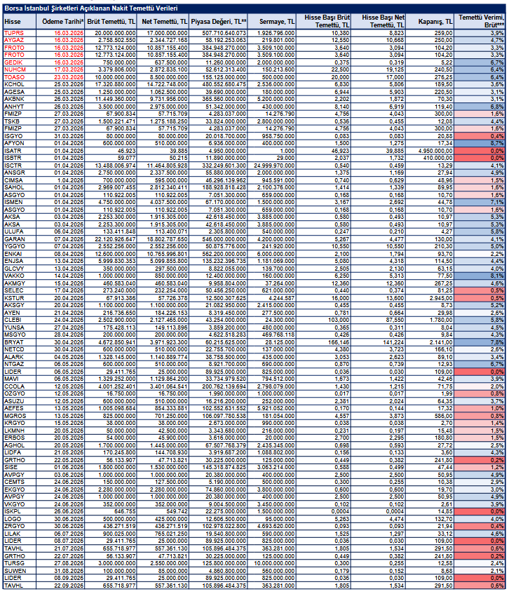 BMD Araştırma’nın analizine göre, 2025 yılı karından temettü dağıtımına dair yönetim kurulu kararı almış BİST şirketlerinin dağıtmayı planladığı nakit temettü tutarı, temettü dağıtım tarihi ve temettü verileri şu şekilde: