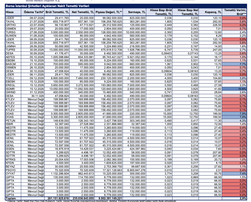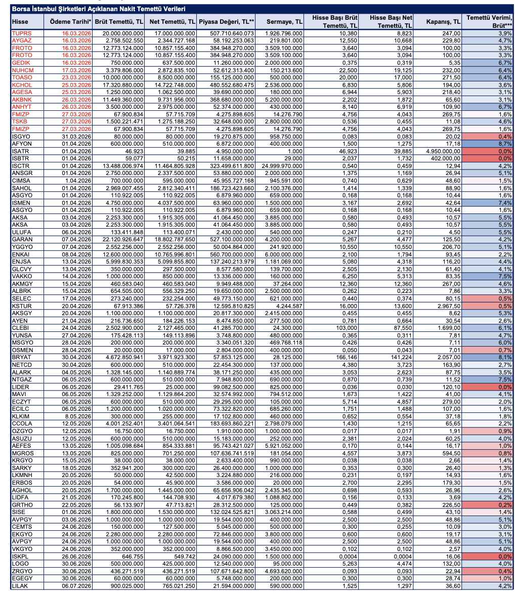 BMD Araştırma’nın analizine göre, 2025 yılı karından temettü dağıtımına dair yönetim kurulu kararı almış BİST şirketlerinin dağıtmayı planladığı nakit temettü tutarı, temettü dağıtım tarihi ve temettü verileri şu şekilde: