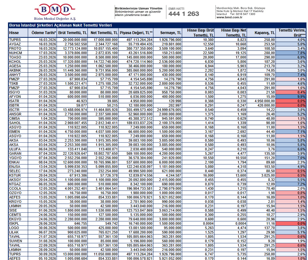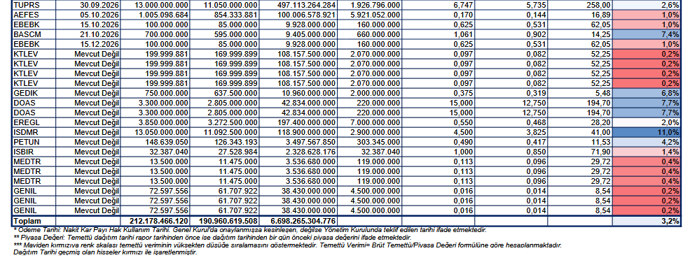 BMD Araştırma’nın değerlendirmesine göre, 2025 yılı kârından temettü dağıtımına dair yönetim kurulu kararı almış BİST şirketlerinin dağıtmayı planladığı nakit temettü tutarı, temettü dağıtım tarihi ve temettü verileri şu şekilde: