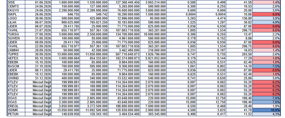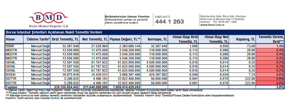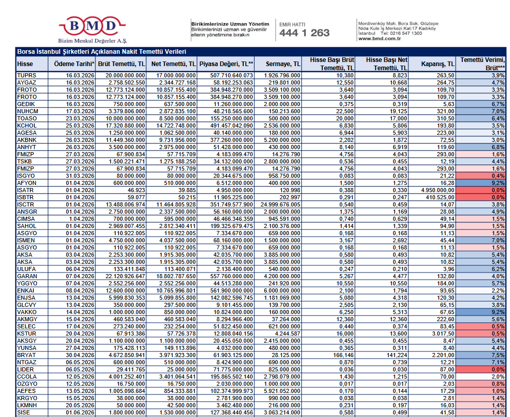 BMD Araştırma’nın analizine göre, 2025 yılı karından temettü dağıtımına dair yönetim kurulu kararı almış BİST şirketlerinin dağıtmayı planladığı nakit temettü tutarı, temettü dağıtım tarihi ve temettü verileri şu şekilde: