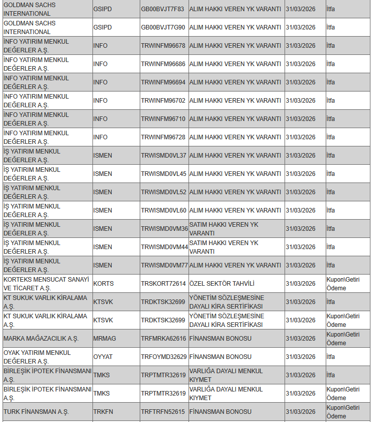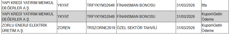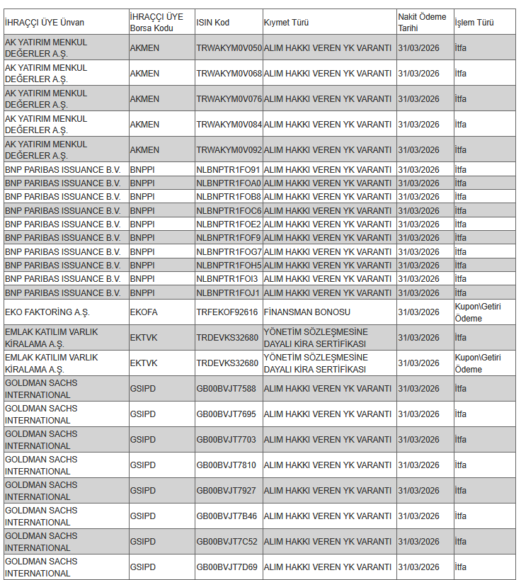 Borçlanma araçları, yatırım fonları, varant itfa/kupon/getiri/nakdi uzlaşı ödeme işlemlerine ilişkin bildirim yapıldı.