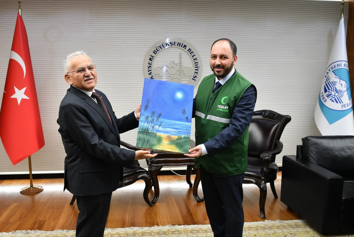 Kayseri Büyükşehir Belediye Başkanı Dr. Memduh Büyükkılıç, Yeşilay Kayseri Şube Başkanlığı görevine seçilen Mustafa Demir ve yönetim kurulu üyelerini makamında kabul etti.