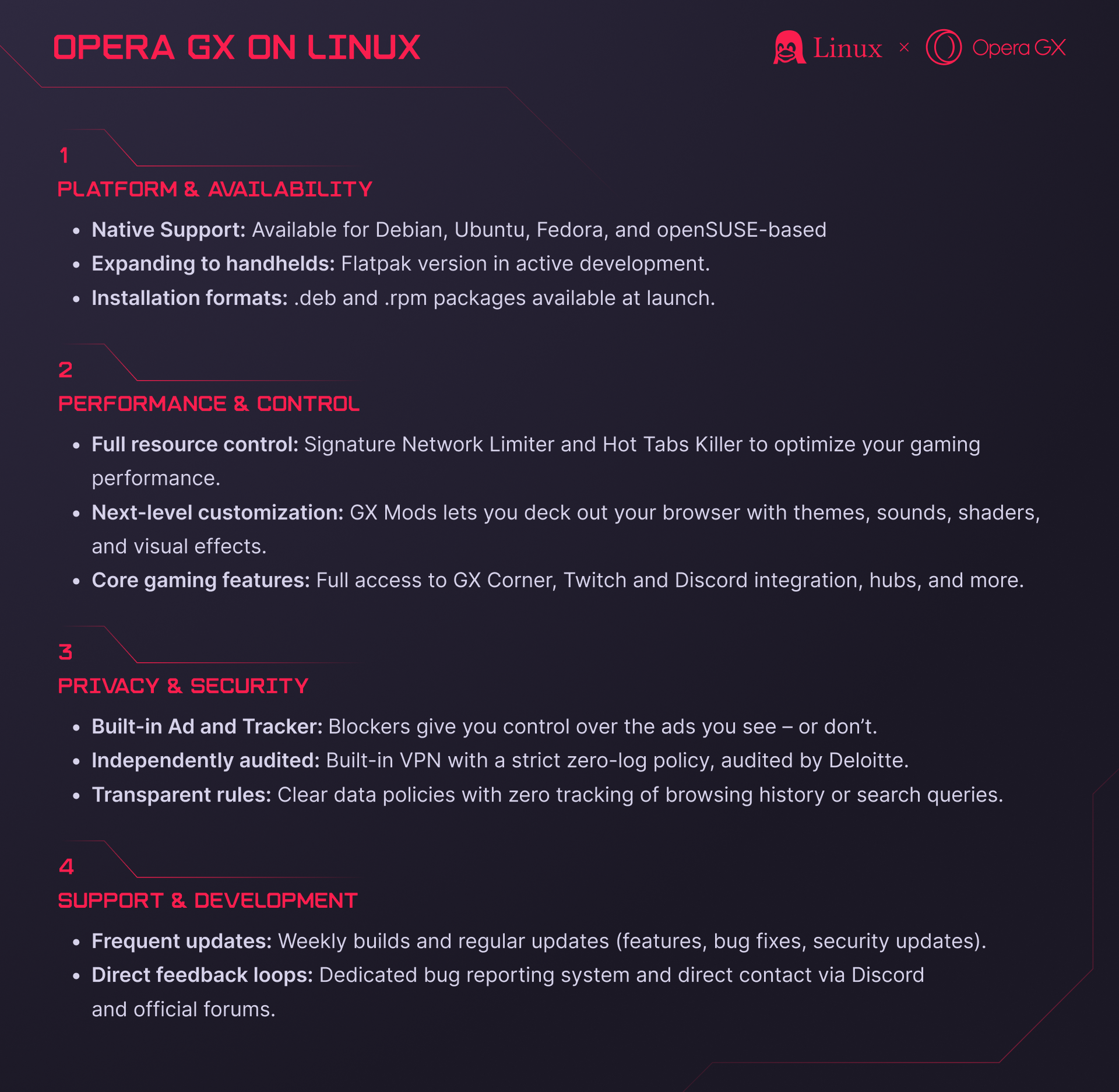 Linux üzerindeki Opera GX; Debian, Ubuntu, Fedora ve OpenSUSE tabanlı dağıtımları destekliyor. Tarayıcı, .deb ve .rpm paketleriyle kurulabilirken; Flatpak desteği ise hâlen geliştirme aşamasında bulunuyor.