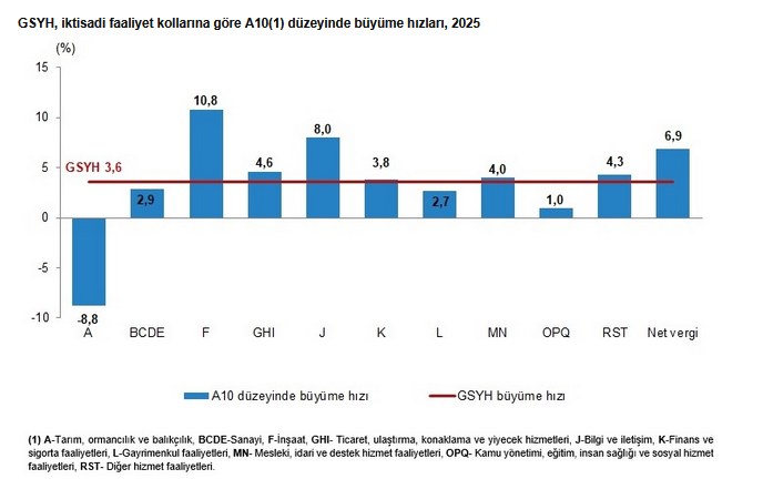 GSYH'yi oluşturan faaliyetler incelendiğinde; 2025 yılında bir önceki yıla göre zincirlenmiş hacim endeksi olarak; inşaat sektörü toplam katma değeri yüzde 10,8, bilgi ve iletişim faaliyetleri yüzde 8,0, ürün üzerindeki vergiler eksi sübvansiyonlar yüzde 6,9, ticaret, ulaştırma, konaklama ve yiyecek hizmetleri yüzde 4,6, diğer hizmet faaliyetleri yüzde 4,3, mesleki, idari ve destek hizmet faaliyetleri yüzde 4,0, finans ve sigorta faaliyetleri yüzde 3,8, sanayi yüzde 2,9, gayrimenkul faaliyetleri yüzde 2,7, kamu yönetimi, eğitim, insan sağlığı ve sosyal hizmet faaliyetleri yüzde 1,0 arttı. Tarım sektörü ise yüzde 8,8 azaldı.