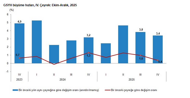 GSYH 2025 yılının dördüncü çeyrek ilk tahmini; zincirlenmiş hacim endeksi olarak, bir önceki yılın aynı çeyreğine göre yüzde 3,4 arttı.