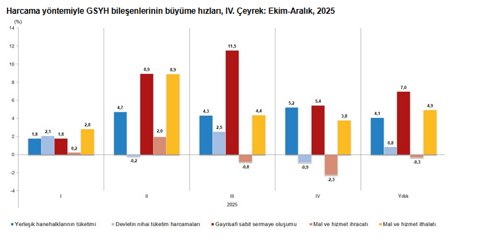 Yerleşik hanehalklarının nihai tüketim harcamaları 2025 yılının dördüncü çeyreğinde bir önceki yılın aynı çeyreğine göre zincirlenmiş hacim endeksi olarak yüzde 5,2 arttı. Devletin nihai tüketim harcamaları yüzde 0,9 azalırken gayrisafi sabit sermaye oluşumu yüzde 5,4 arttı.