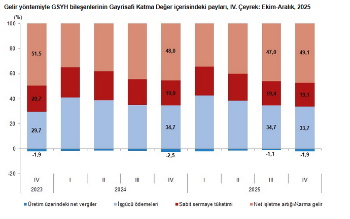 İşgücü ödemelerinin cari fiyatlarla Gayrisafi Katma Değer içerisindeki payı geçen yıl yüzde 37,0 iken bu oran 2025 yılında yüzde 36,9 oldu. Net işletme artığı/karma gelirin payı ise yüzde 43,1 iken yüzde 44,1 oldu.