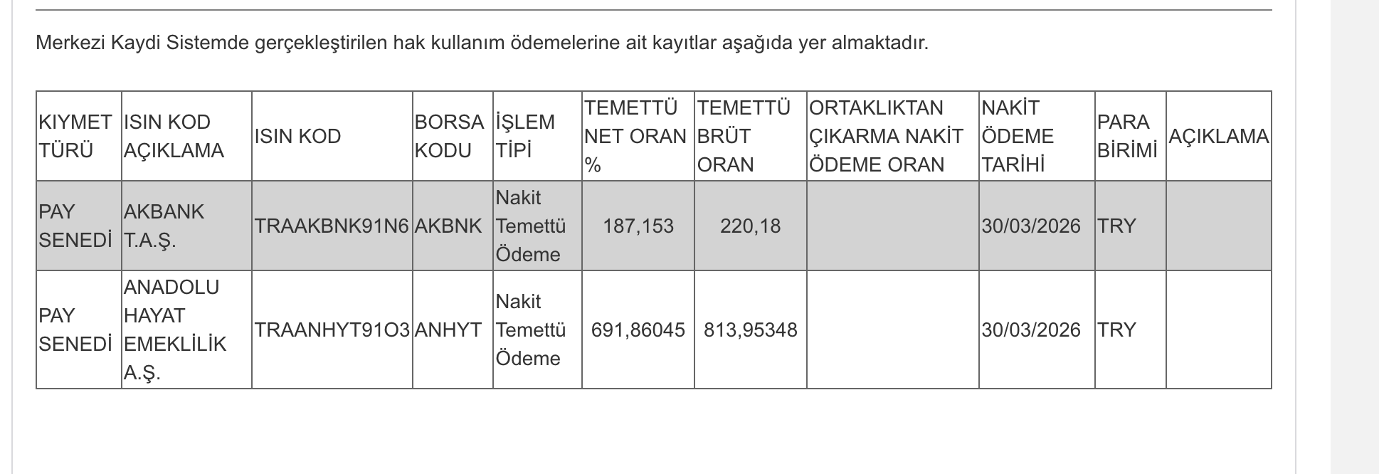 Kamuyu Aydınlatma Platformuna (KAP) yapılan açıklamaya göre, Merkezi Kaydi Sistemde gerçekleştirilen hak kullanım ödemelerine ait kayıtlar şöyle: