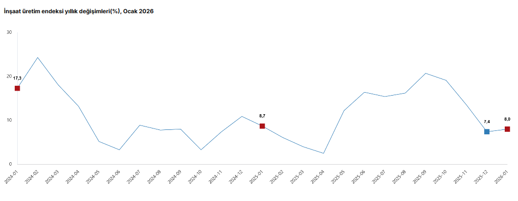 İstanbul, 13 Mart (Hibya) – İnşaat üretimi yıllık bazda yüzde 8,0, aylık 0,9 arttı.