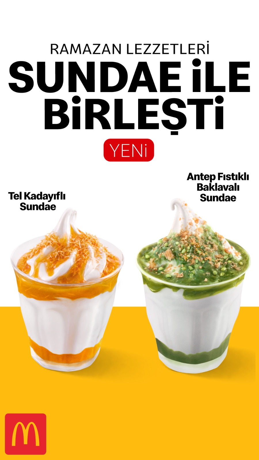 Tel kadayıfın çıtır dokusu ve Antep fıstıklı baklavanın eşsiz aroması, serinletici Sundae lezzetiyle bir araya gelerek iftar sonrası için keyifli bir alternatif oluşturuyor. Tel Kadayıflı Sundae ve Antep Fıstıklı Baklavalı Sundae, Ramazan ayı boyunca McDonald’s Türkiye restoranlarında tatlı severleri bekliyor.