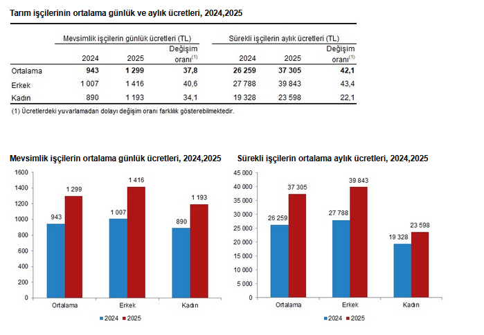 Türkiye İstatistik Kurumu’nun (TÜİK) verilerine göre, tarımsal işletmelerde 2025 yılında mevsimlik tarım işçilerinin günlük ücretleri bir önceki yıla göre yüzde 37,8 artarak 1 299 TL, sürekli tarım işçilerinin aylık ücretleri ise yüzde 42,1 artarak 37 bin 305 TL’ye yükseldi.