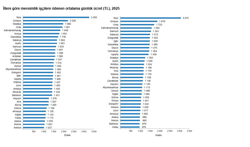Tarımsal işletmelerde 2025 yılında mevsimlik tarım işçilerine yapılan en yüksek günlük ücret ödemesi erkek işçiler için 3 bin 283 TL, kadın işçiler için 3 bin 75 TL ile Rize’de gerçekleşti. En düşük ücret ödemesi ise erkek işçiler için 1 037 TL ile Ankara, kadın işçiler için ise 976 TL ile Hatay’da gerçekleşti.