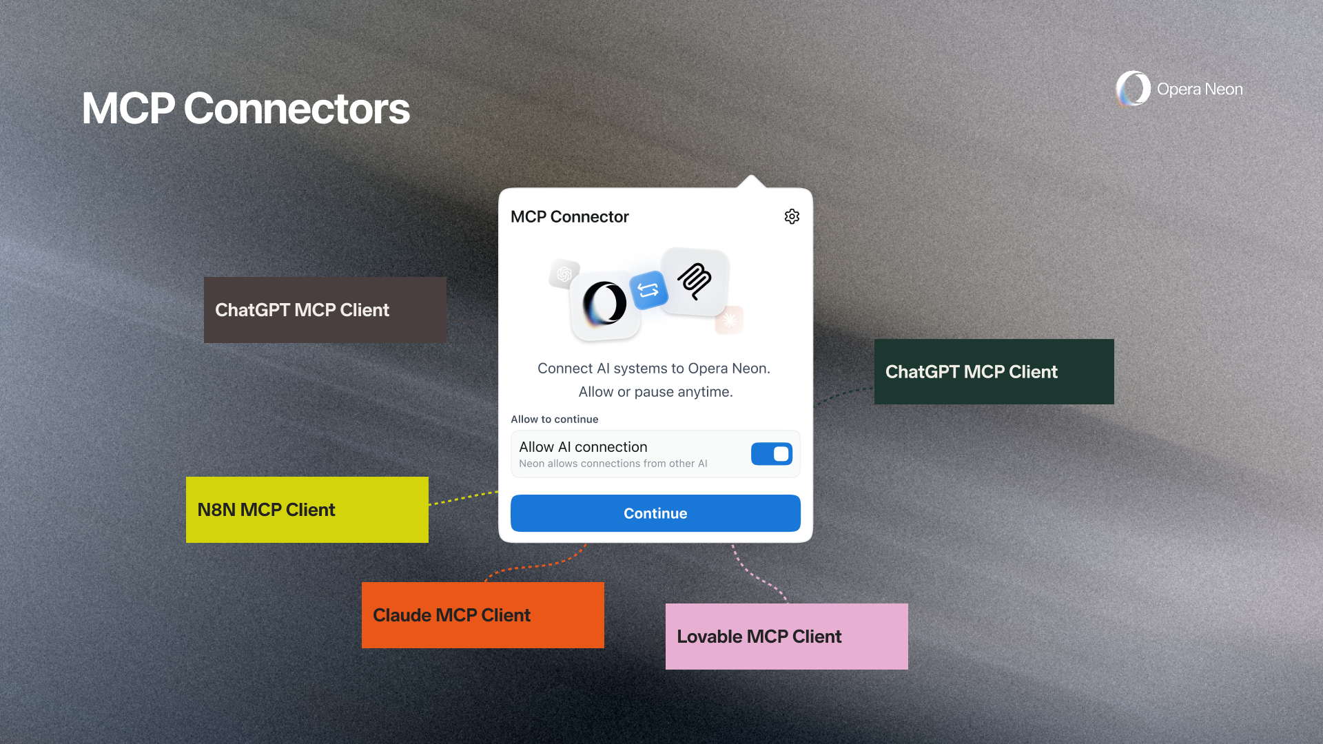 Opera, yeni MCP Connector özelliğiyle Opera Neon’u yapay zekâ istemcilerinin doğrudan tarayıcıya bağlanabildiği bir yürütme katmanına dönüştürüyor. Claude, ChatGPT, Lovable ve n8n gibi popüler yapay zekâ araçları artık tarayıcı içinde çalışarak canlı web bağlamına erişebiliyor ve kullanıcı adına işlem gerçekleştirebiliyor.