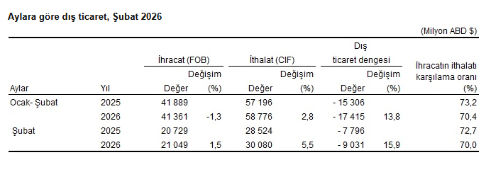 Türkiye İstatistik Kurumu’nun (TÜİK) verilerine göre, Türkiye İstatistik Kurumu ile Ticaret Bakanlığı iş birliğiyle genel ticaret sistemi kapsamında üretilen geçici dış ticaret verilerine göre; ihracat 2026 yılı Şubat ayında, bir önceki yılın aynı ayına göre yüzde 1,5 artarak 21 milyar 49 milyon dolar, ithalat yüzde 5,5 artarak 30 milyar 80 milyon dolar olarak gerçekleşti.