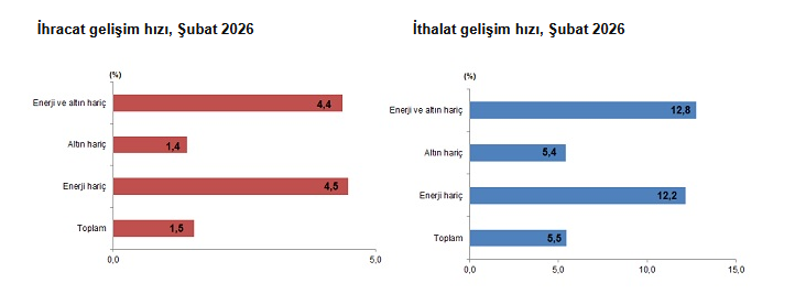 Mevsim ve takvim etkilerinden arındırılmış seriye göre; 2026 Şubat ayında bir önceki aya göre ihracat yüzde 1,2, ithalat yüzde 1,1 arttı. Takvim etkilerinden arındırılmış seriye göre ise; 2026 yılı Şubat ayında bir önceki yılın aynı ayına göre ihracat yüzde 1,5, ithalat yüzde 5,5 arttı.