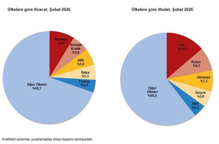 İthalatta Çin ilk sırayı aldı. Şubat ayında Çin’den yapılan ithalat 4 milyar 125 milyon dolar olurken, bu ülkeyi sırasıyla; 2 milyar 497 milyon dolar ile Rusya Federasyonu, 2 milyar 211 milyon dolar ile Almanya, 1 milyar 685 milyon dolar ile İsviçre, 1 milyar 352 milyon dolar ile ABD izledi. İlk 5 ülkeden yapılan ithalat, toplam ithalatın yüzde 39,5’ini oluşturdu.