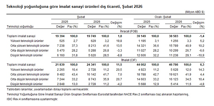 Teknoloji yoğunluğuna göre dış ticaret verileri, ISIC Rev.4 sınıflaması içinde yer alan imalat sanayi ürünlerini kapsamaktadır. Şubat ayında ISIC Rev.4’e göre imalat sanayi ürünlerinin toplam ihracattaki payı yüzde 93,8’dir. Yüksek teknoloji ürünlerinin imalat sanayi ürünleri ihracatı içindeki payı yüzde 3,2’dir. Ocak-Şubat döneminde ISIC Rev.4’e göre imalat sanayi ürünlerinin toplam ihracattaki payı yüzde 93,3’tür. Ocak-Şubat döneminde yüksek teknoloji ürünlerinin imalat sanayi ürünleri ihracatı içindeki payı yüzde 3,3’tür.