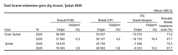 Özel ticaret sistemine göre ihracat, 2026 yılı Ocak-Şubat döneminde, bir önceki yılın aynı dönemine göre yüzde 0,3 azalarak 37 milyar 992 milyon dolar, ithalat yüzde 4,6 artarak 56 milyar 127 milyon dolar olarak gerçekleşti.