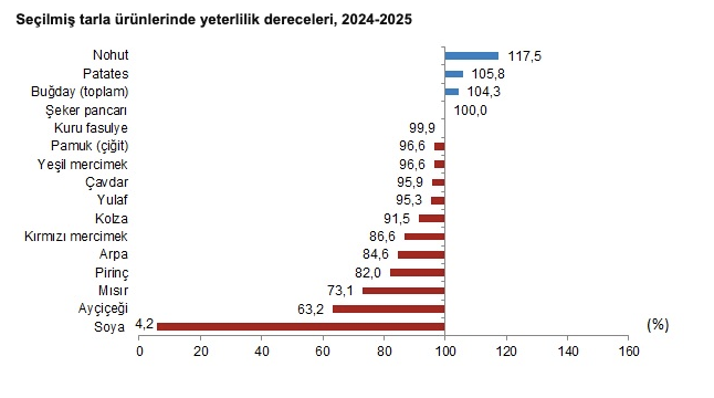 Türkiye İstatistik Kurumu’nun (TÜİK) verilerine göre,Tahıl ürünleri toplamı için 2024-2025 piyasa döneminde yurt içi üretimin yurt içi talebi karşılama derecesi (yeterlilik derecesi) yüzde 91,1 olarak gerçekleşti. Toplam tahıl üretiminde en büyük paya sahip olan buğdayın yeterlilik derecesi yüzde 104,3 (durum buğdayında yüzde 202,0, diğer buğdayda yüzde 92,3); yem sanayinin en önemli girdilerini oluşturan arpanın yeterlilik derecesi yüzde 84,6, mısırın yeterlilik derecesi yüzde 73,1, soyanın yeterlilik derecesi ise yüzde 4,2 olarak gerçekleşti.