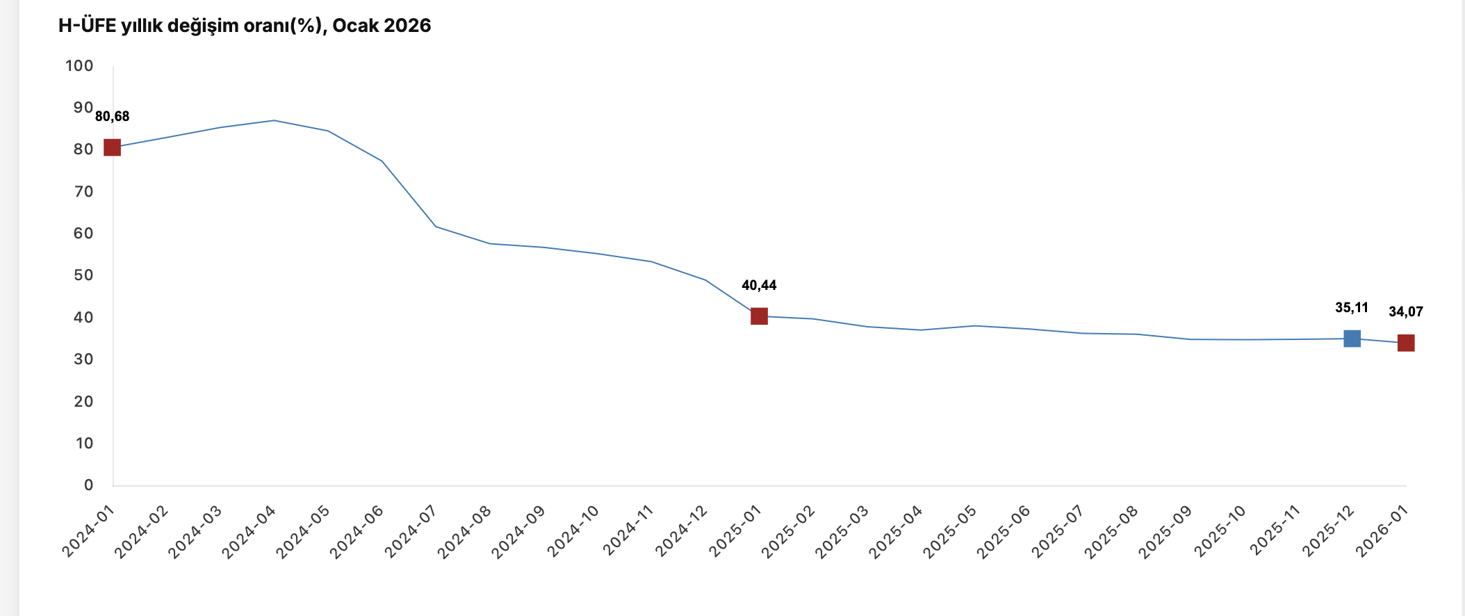 Türkiye İstatistik Kurumu’nun (TÜİK) verilerine göre, H-ÜFE 2026 yılı Ocak ayında bir önceki aya göre yüzde 7,74 artış, bir önceki yılın Aralık ayına göre yüzde 7,74 artış ve on iki aylık ortalamalara göre yüzde 36,27 artış gösterdi.