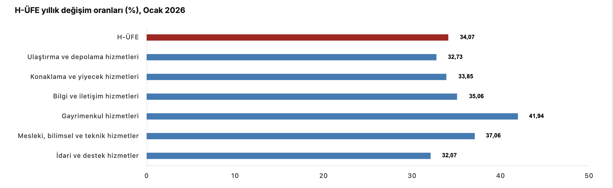 Bir önceki yılın aynı ayına göre; ulaştırma ve depolama hizmetlerinde yüzde 32,73 artış, konaklama ve yiyecek hizmetlerinde yüzde 33,85 artış, bilgi ve iletişim hizmetlerinde yüzde 35,06 artış, gayrimenkul hizmetlerinde yüzde 41,94 artış, mesleki, bilimsel ve teknik hizmetlerde yüzde 37,06 artış, idari ve destek hizmetlerde yüzde 32,07 artış gerçekleşti.