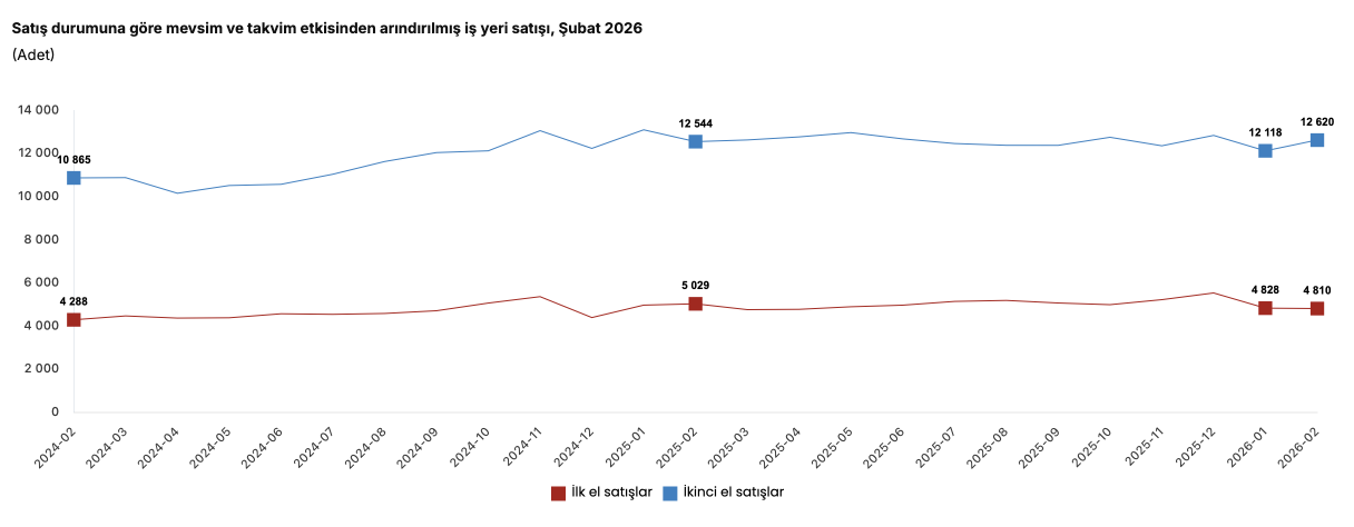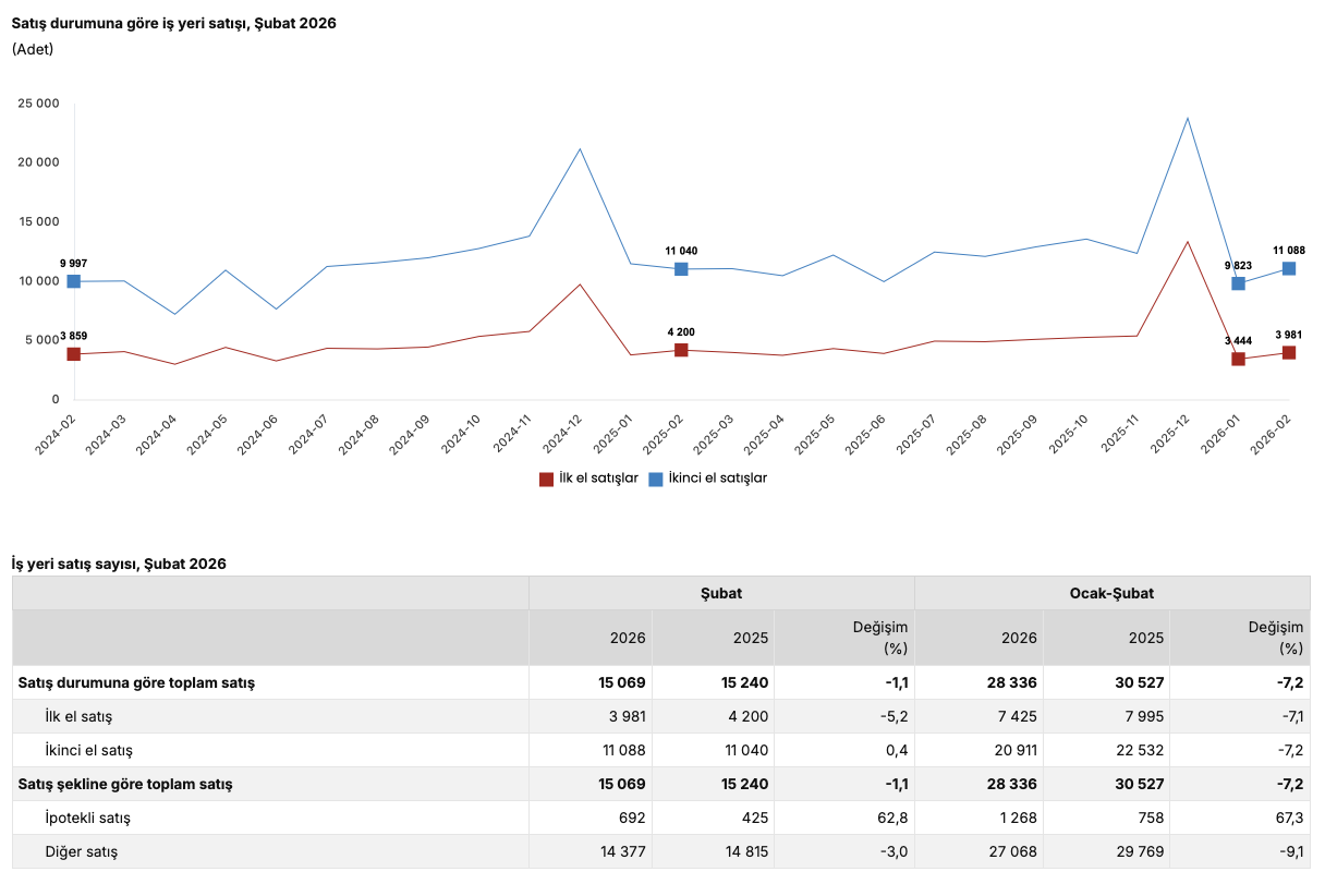 Türkiye genelinde ilk el iş yeri satış sayısı Şubat ayında bir önceki yılın aynı ayına göre yüzde 5,2 oranında azalarak 3 bin 981 oldu. İkinci el iş yeri satışları ise Şubat ayında bir önceki yılın aynı ayına göre yüzde 0,4 oranında artarak 11 bin 88 oldu.