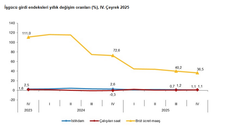 Sanayi, inşaat ve ticaret-hizmet sektörleri toplamında brüt ücret-maaş endeksi, 2025 yılı IV. çeyreğinde bir önceki yılın aynı çeyreğine göre yüzde 36,5 arttı. Alt sektörler incelendiğinde, endeks; sanayi sektöründe yüzde 31,3, inşaat sektöründe yüzde 41,2 ve ticaret-hizmet sektörlerinde yüzde 39,3 arttı.