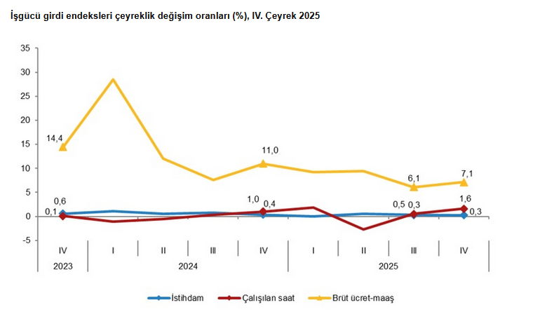 Sanayi, inşaat ve ticaret-hizmet sektörleri toplamında brüt ücret-maaş endeksi, 2025 yılı IV. çeyreğinde bir önceki çeyreğe göre yüzde 7,1 arttı. Alt sektörler incelendiğinde, endeks; sanayi sektöründe yüzde 7,2, inşaat sektöründe yüzde 6,4 ve ticaret-hizmet sektörlerinde yüzde 7,2 arttı.