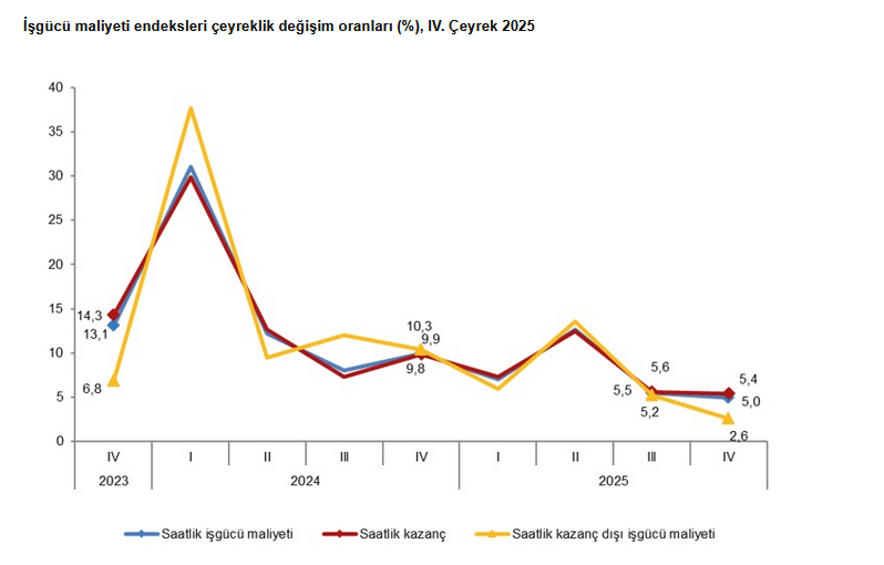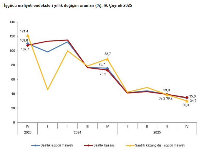 Sanayi, inşaat ve ticaret-hizmet sektörleri toplamında saatlik kazanç dışı işgücü maliyeti endeksi, 2025 yılı IV. çeyreğinde bir önceki yılın aynı çeyreğine göre yüzde 30,3 arttı. Alt sektörler incelendiğinde, endeks; sanayi sektöründe yüzde 25,9, inşaat sektöründe yüzde 33,6 ve ticaret-hizmet sektörlerinde yüzde 33,9 arttı.