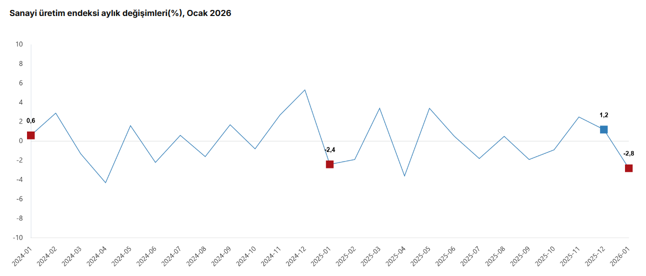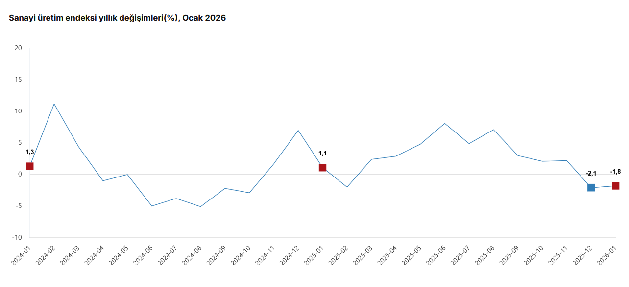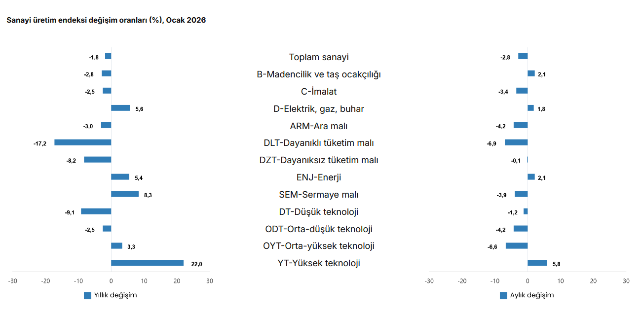 Türkiye İstatistik Kurumu (TÜİK) verilerine göre, sanayinin alt sektörleri (2021=100 referans yıllı) incelendiğinde, 2026 yılı Ocak ayında madencilik ve taş ocakçılığı sektörü endeksi bir önceki yılın aynı ayına göre yüzde 2,8 azaldı, imalat sanayi sektörü endeksi yüzde 2,5 azaldı ve elektrik, gaz, buhar ve iklimlendirme üretimi ve dağıtımı sektörü endeksi yüzde 5,6 arttı.