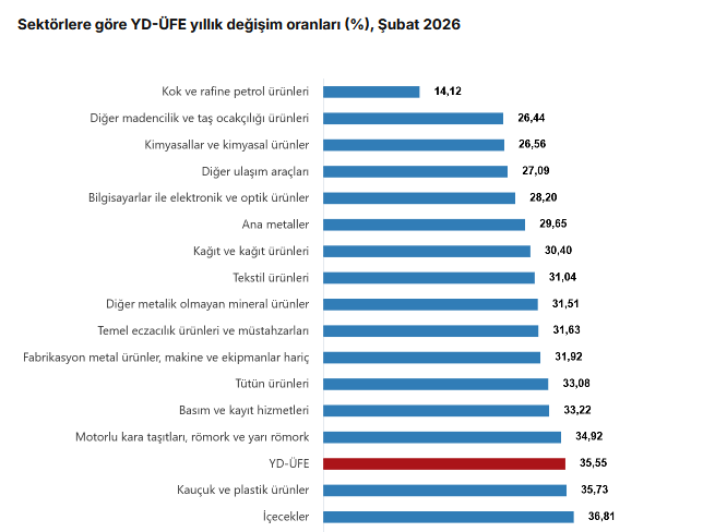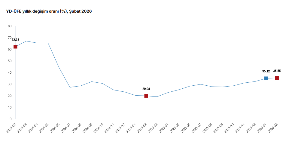 Türkiye İstatistik Kurumu’nun (TÜİK) verilerine göre, YD-ÜFE 2026 yılı Şubat ayında bir önceki aya göre yüzde 2,38, bir önceki yılın Aralık ayına göre yüzde 6,53, bir önceki yılın aynı ayına göre yüzde 35,55, ve on iki aylık ortalamalara göre yüzde 28,90 artış gösterdi.