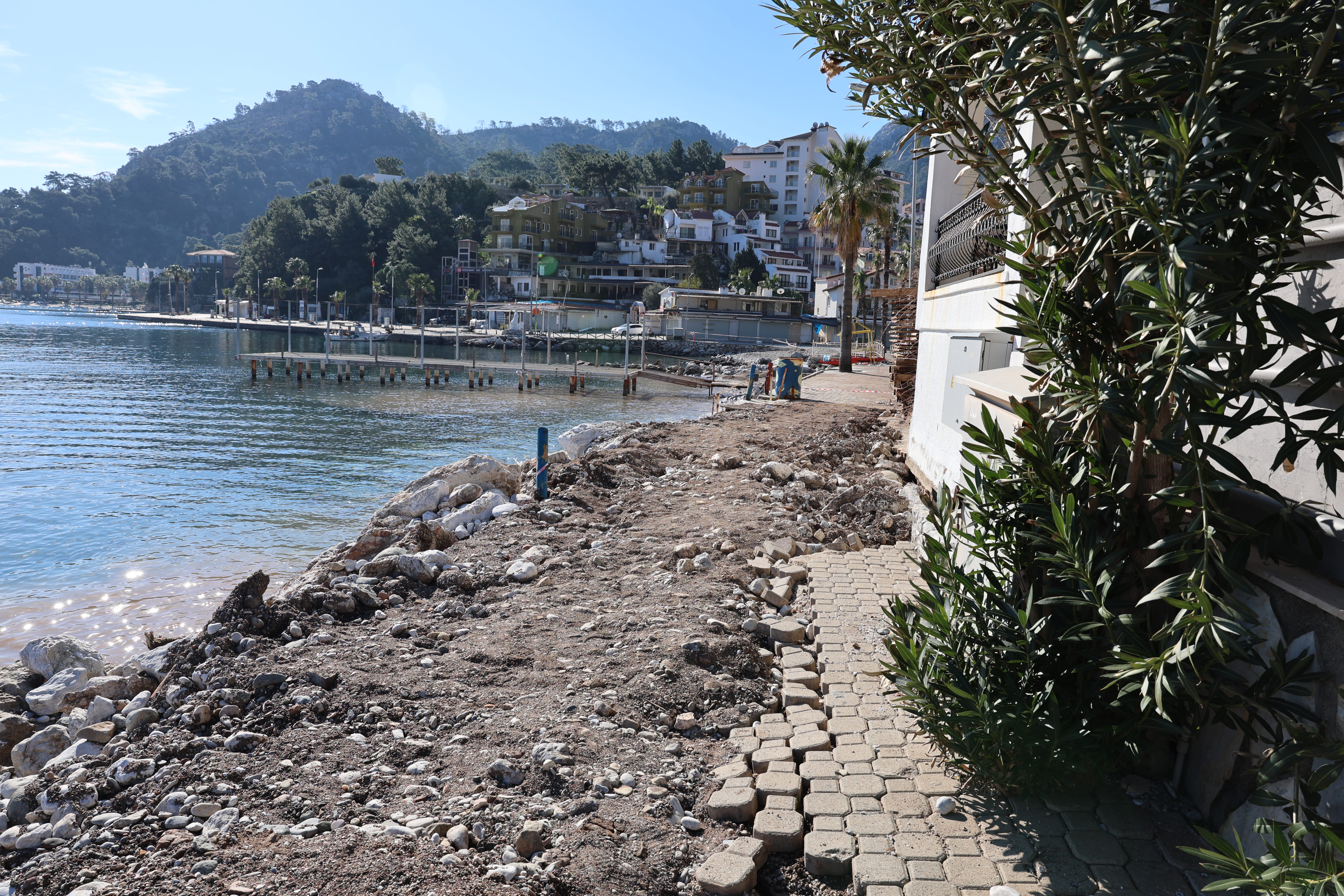 Marmaris Belediyesi ekipleri, olumsuz hava koşulları ve kuvvetli dalga hareketleri nedeniyle Turunç sahil yürüyüş yolunda meydana gelen hasarların giderilmesi için çalışma başlattı.