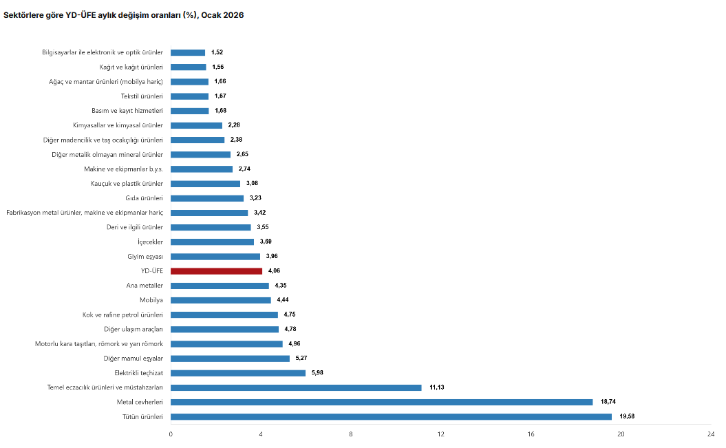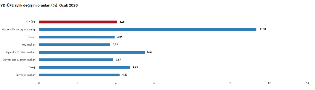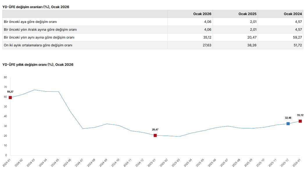 Türkiye İstatistik Kurumu’nun (TÜİK) verilerine göre, YD-ÜFE Ocak'ta aylık bazda yüzde 4,06, bir önceki yılın Aralık ayına göre yüzde 4,06, yıllık bazda yüzde 35,12 ve on iki aylık ortalamalara göre yüzde 27,63 arttı.