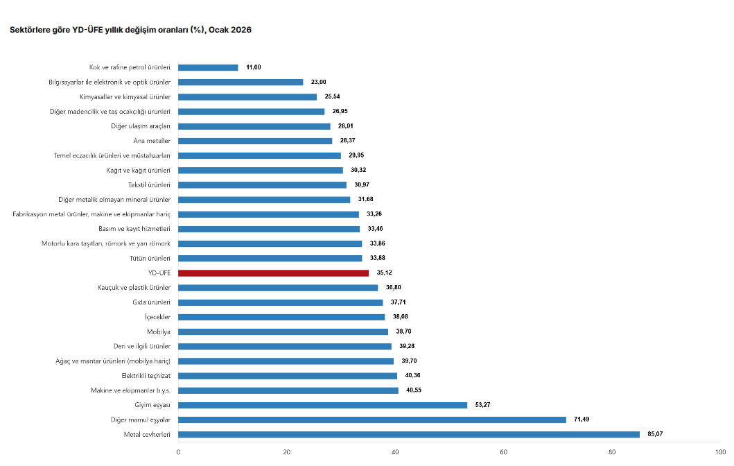 İstanbul, 20 Şubat (Hibya) – Yurt Dışı Üretici Fiyat Endeksi (YD-ÜFE) Ocak’ta yıllık yüzde 35,12, aylık yüzde 4,06 arttı.
